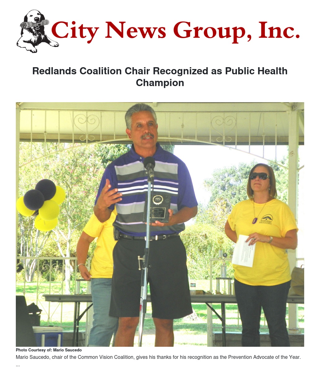 Mario Saucedo, lifelong Redlands resident and chair of the Common Vision Coalition, was honored as “Prevention Advocate of the Year” by the County of San Bernardino Department of Behavioral Health for his outstanding commitment to proactively address and prevent problems related to alcohol and other drugs.