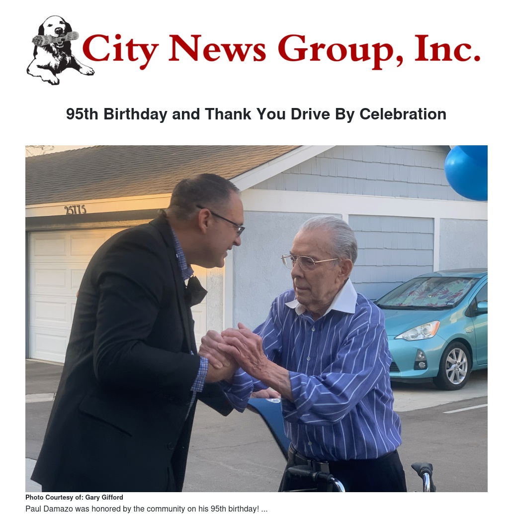 The evening of May 12, 2021, was an exciting evening for two members of our Loma Linda community Paul Damazo and his wife Jay. Recognizing their tremendous contribution of service and leadership to our nation and community, and knowing that Paul’s 95th Birthday was on May 12, several of their friends decided to honor them with a Birthday, Thank-You Drive-By. Because of Covid 19 the friends organized the Drive By preceded by remarks from several dignitaries.