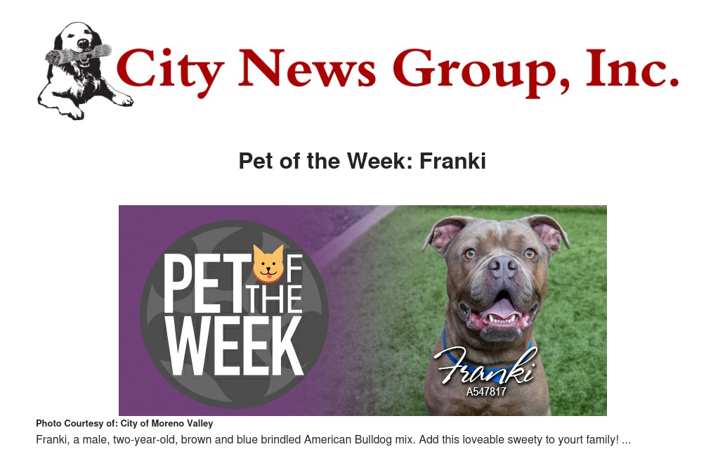 If you would like to make Franki, or any pet from the Moreno Valley Animal Shelter, part of your family, please call 951.413.3790 or visit moval.org/pets.
