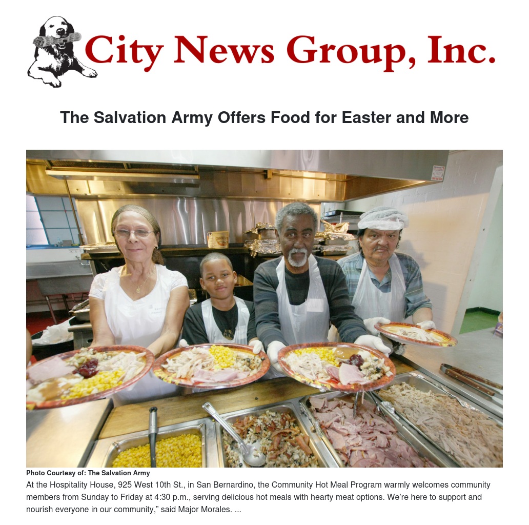 At the Hospitality House, 925 West 10th St., in San Bernardino, the Community Hot Meal Program warmly welcomes community members from Sunday to Friday at 4:30 p.m., serving delicious hot meals with hearty meat options. We’re here to support and nourish everyone in our community,” said Major Morales.