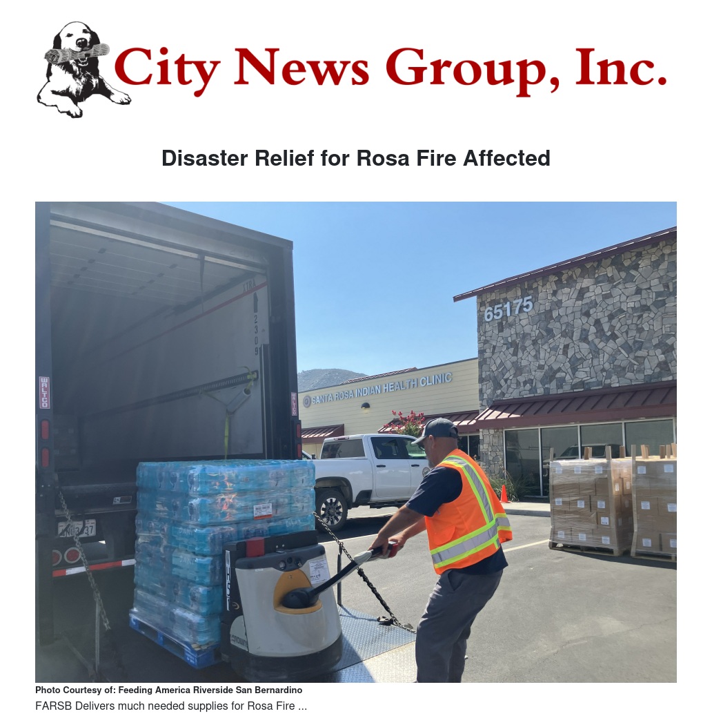 Feeding America Riverside | San Bernardino (FARSB) delivered two truckloads of disaster relief, consisting of 2,100 food boxes totaling 37,800 pounds and 467 gallons of purified and distilled water, to the Santa Rosa Indian Health Clinic to provide food assistance to evacuees affected by the Rosa Fire in Riverside County which burned over 120 acres of land.
