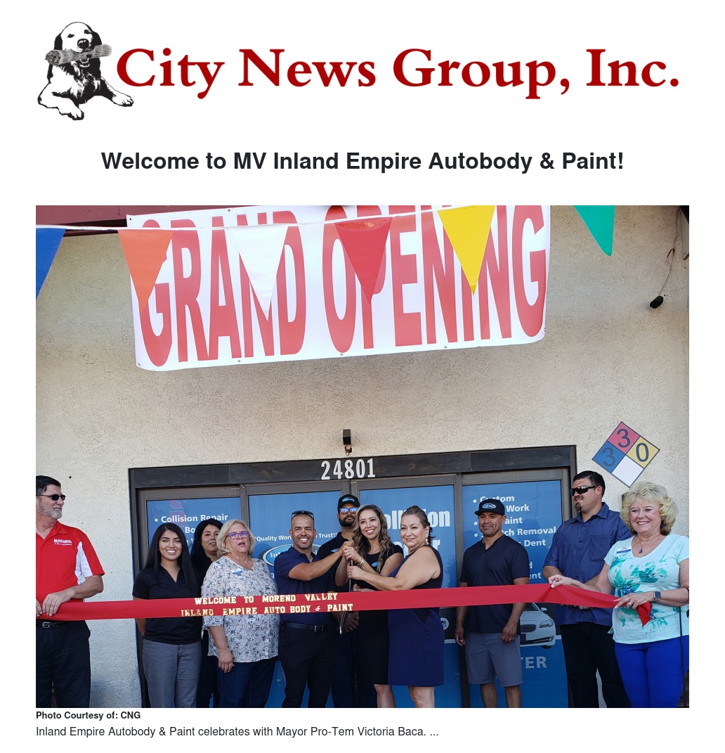 Moreno Valley is glad to have community-minded business owners be a part of the awesome growth and expansion taking place in the area. We welcome Inland Empire Autobody & Paint to our community. May you experience much success!