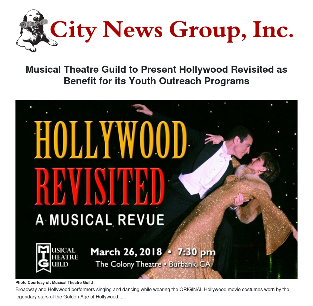 Musical Theatre Guild, the winner of the Los Angeles Drama Critic’s Circle Margaret Harford Award for sustained excellence in the theatre, will present HOLLYWOOD REVISITED as a special benefit to support Musical Theatre Guild’s extensive youth outreach programs. The event, a perfect tie-. in with the company’s “MTG Goes To The Movies” season theme, will take place at Burbank’s Colony Theatre on Monday, March 26, 2018 at 7:30 pm.