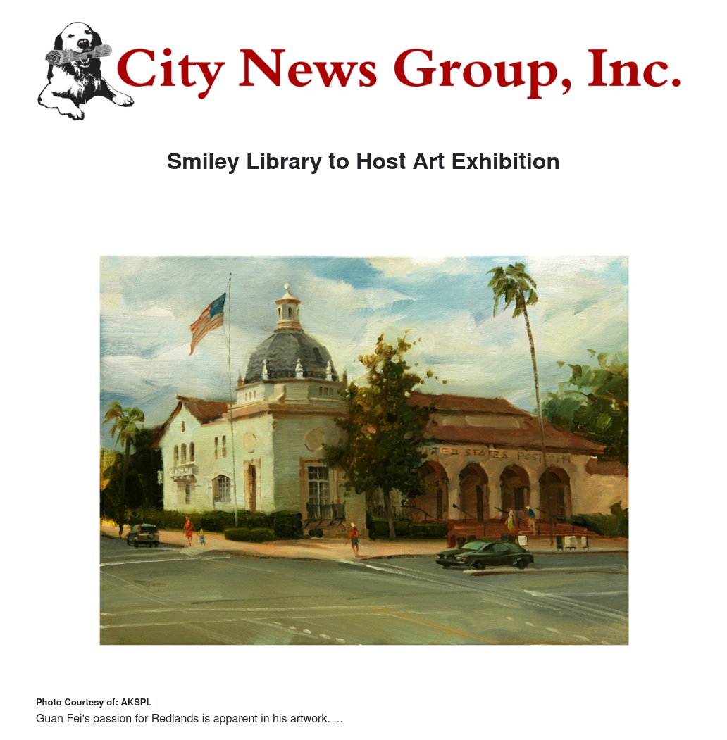 "Guan Fei’s passion for our town is readily apparent in his work," commented Library Director Don McCue. "I'm certain our patrons will enjoy his depictions of some of Redlands’ landmark buildings and impressive landscapes."