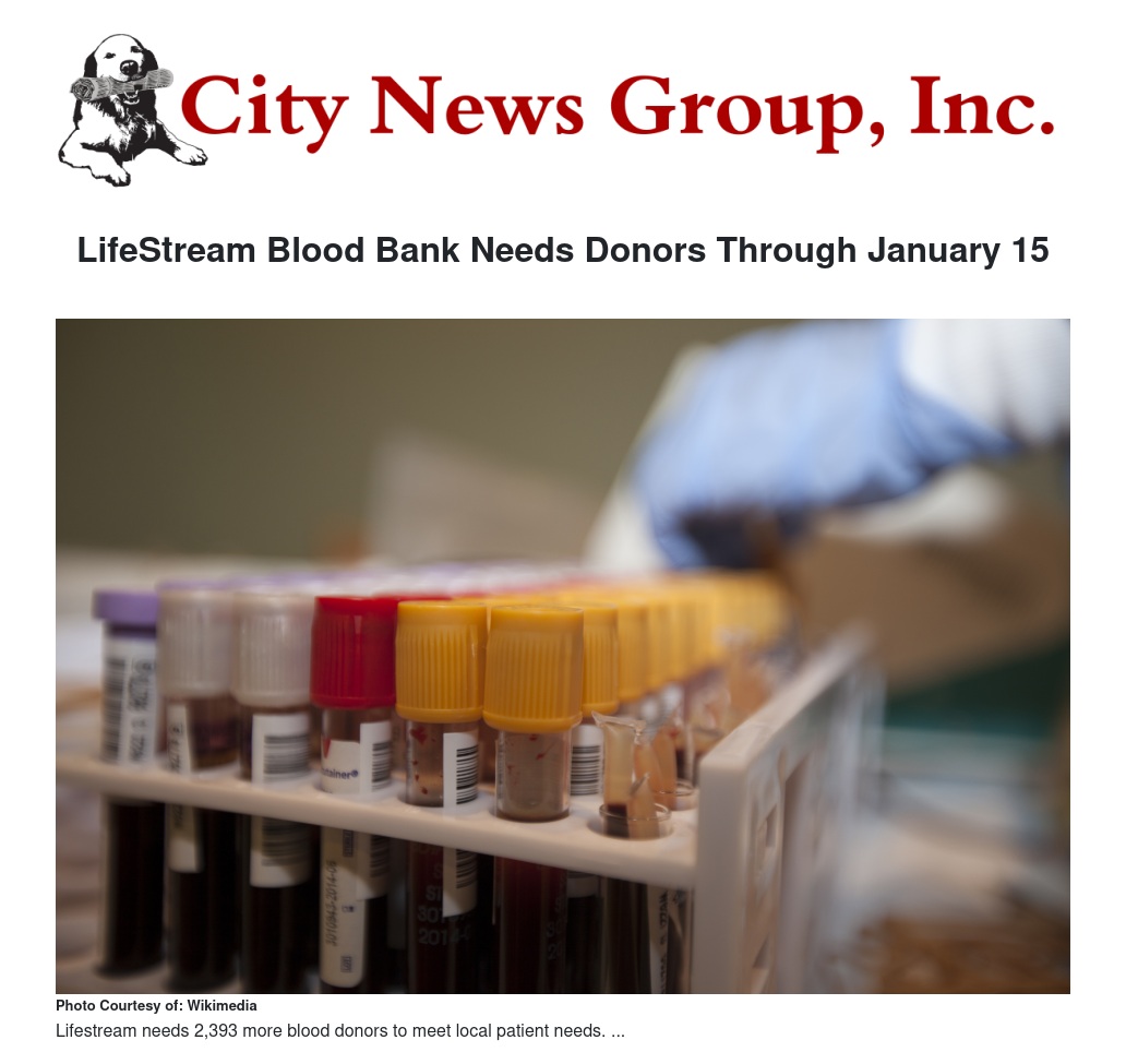 LifeStream Blood Bank Needs Donors Through January 15 by Dina Colunga - City News Group, Inc.