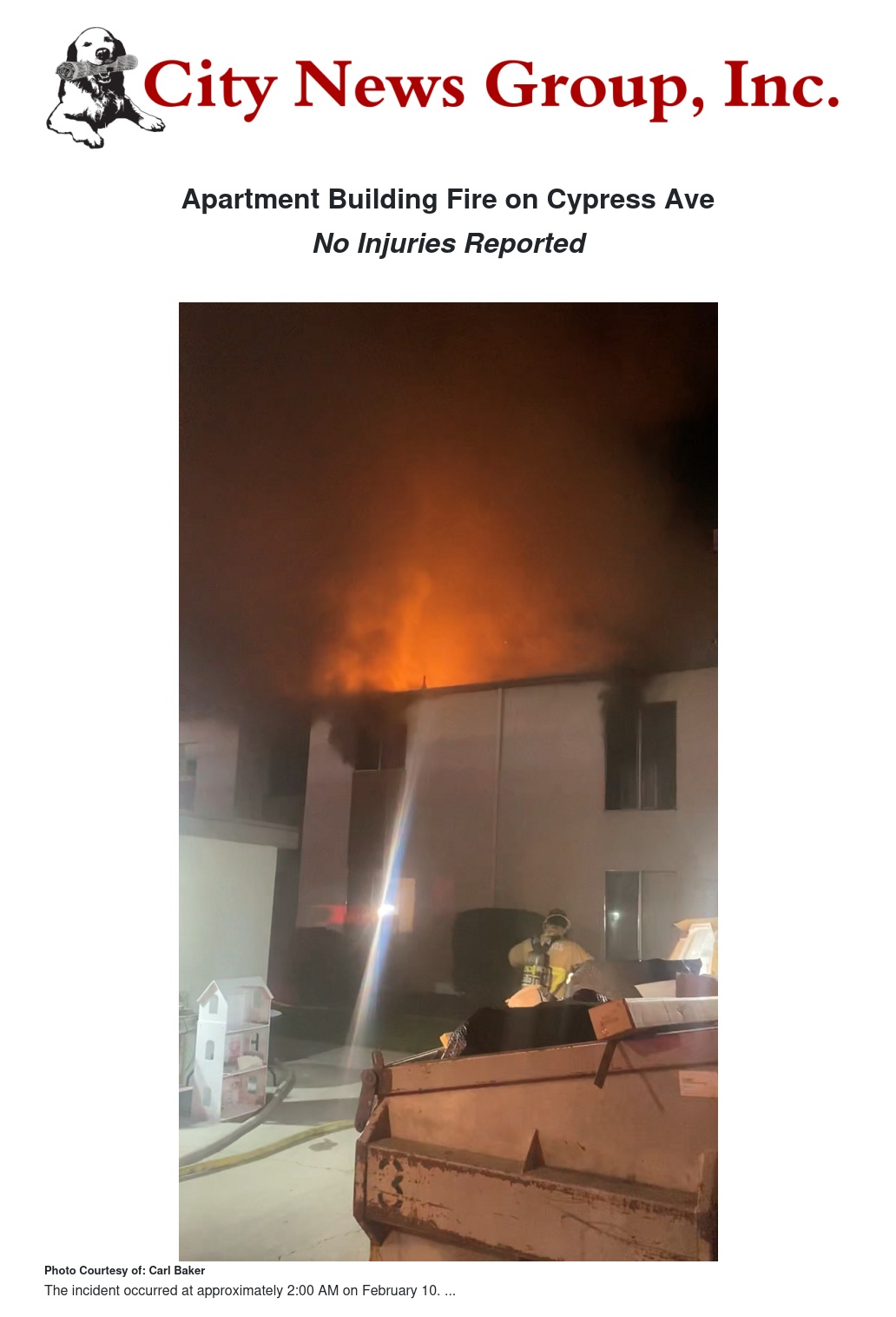 The first unit arrived at approximately 2:00 a.m. to find heavy smoke and fire on the second floor of a two-story apartment building and all residents already evacuated. Firefighters quickly made entry and contained the fire to the apartment of origin.