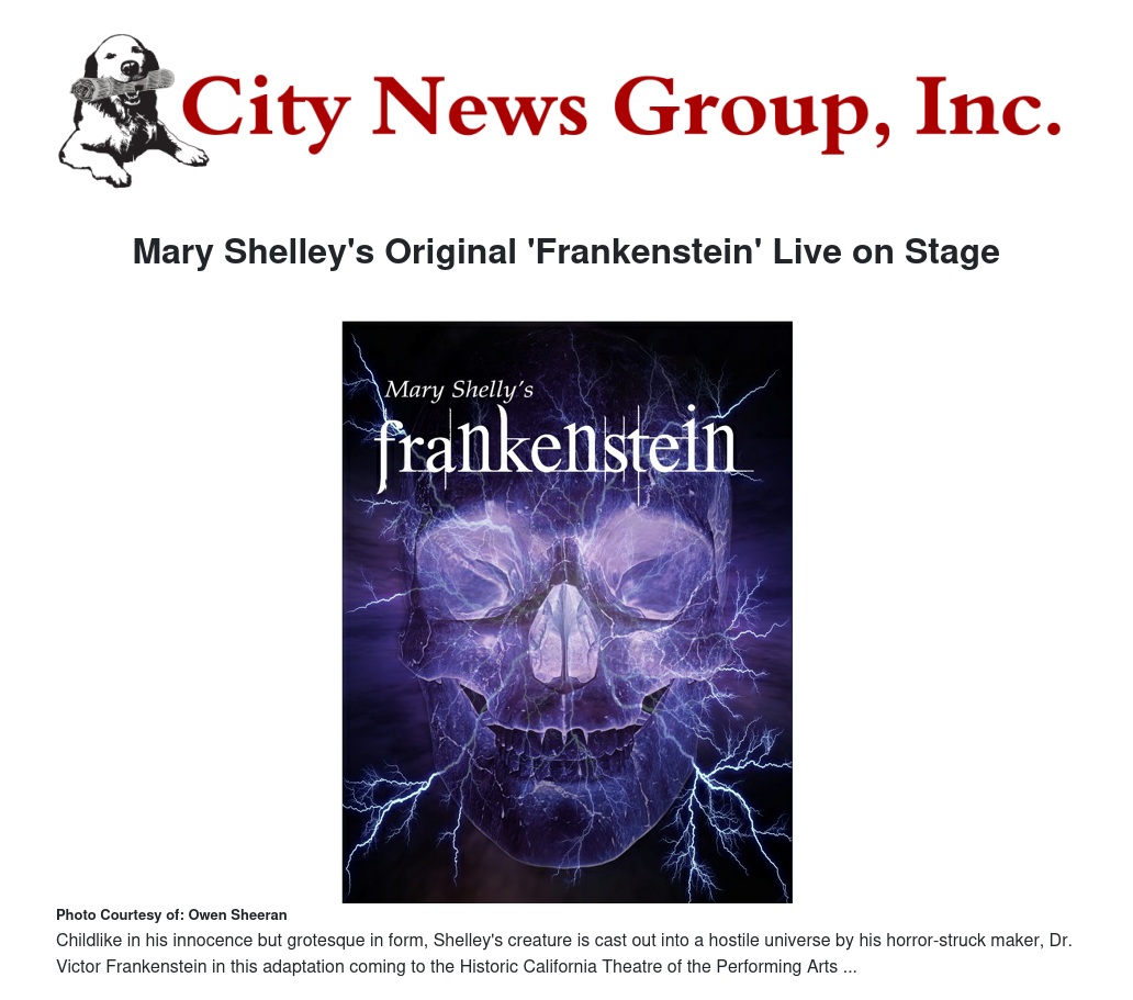 Meet the original "Frankenstein," when the play based on Mary Shelley's original story takes the stage for four performances Feb. 14-16 at the historic California Theatre of the Performing Arts.
