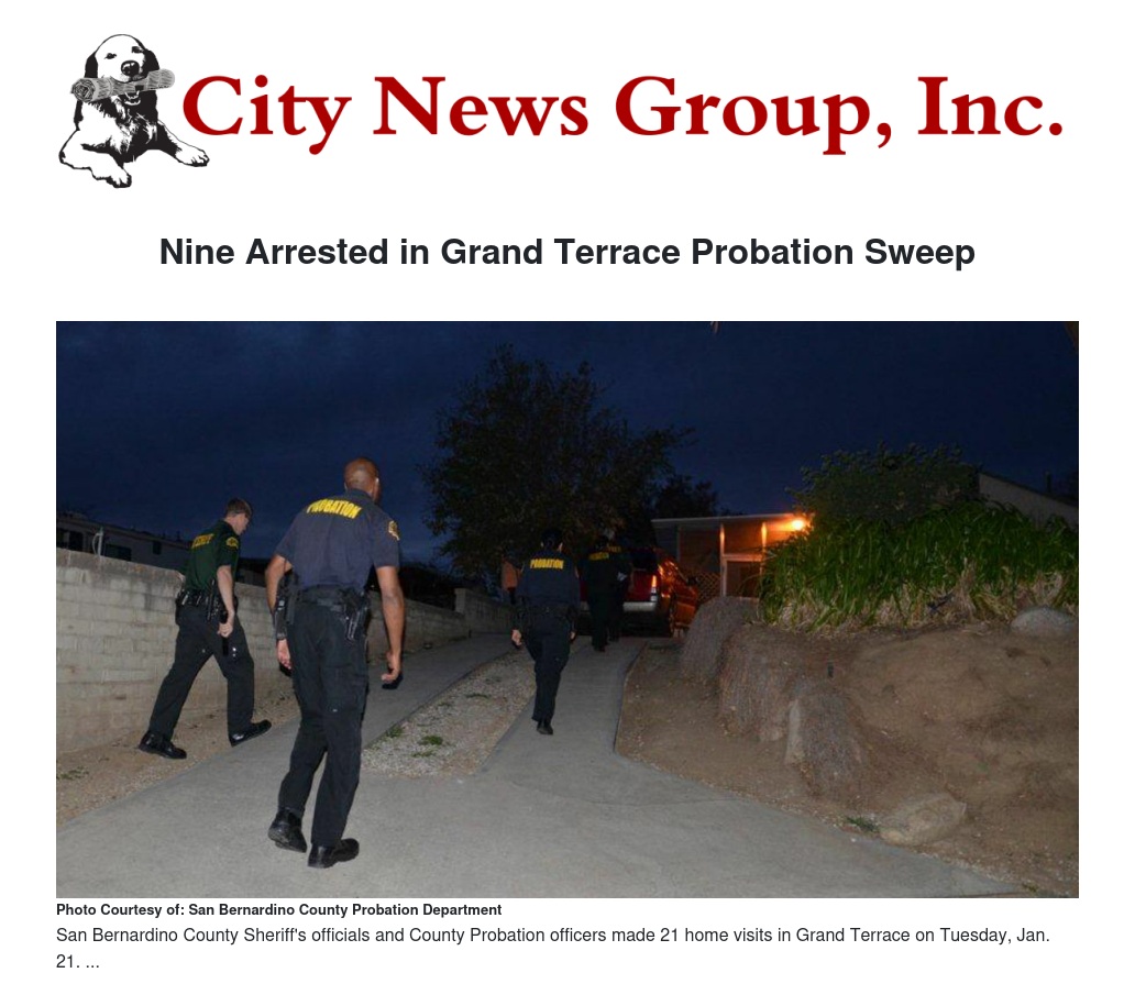 Chief Probation Officer Michelle Scray Brown stated, “[The] Grand Terrace operation is an example of our desire to support cities that have had to contend with the impact of AB 109. Irrespective of the size of the community, our officers will conduct compliance sweeps to provide public safety services.This operation predominately targeted probationers. In addition to AB 109 offenders, we still provide supervision of adult and juvenile probationers and offer a wide range of rehabilitative services that prevent re-offense.”