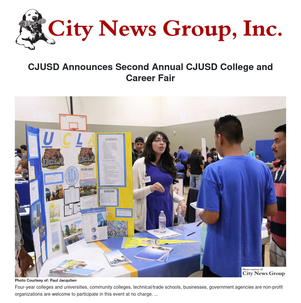 “We are excited and proud to bring the CJUSD College and Career Fair to our community for a second year,” noted Superintendent Jerry Almendarez. “Last year’s event was a huge success with more than 3,000 in attendance and we are looking forward to another great event where our students can get the information they need to plan for the future.”