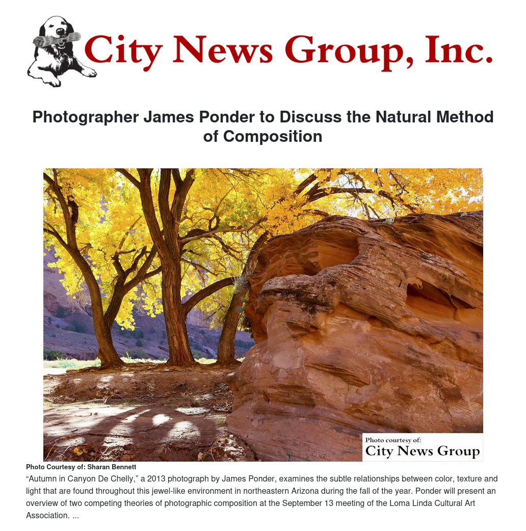 Fine art photographer, James Ponder, will discuss “The Natural Method of Composition—What the Camera Clubs Can’t Tell You” during the September meeting of the Loma Linda Cultural Arts Association, from 2 to 4 p.m. on Sunday, Sept. 13 at the Loma Linda Senior Center, 25541 Barton Road.