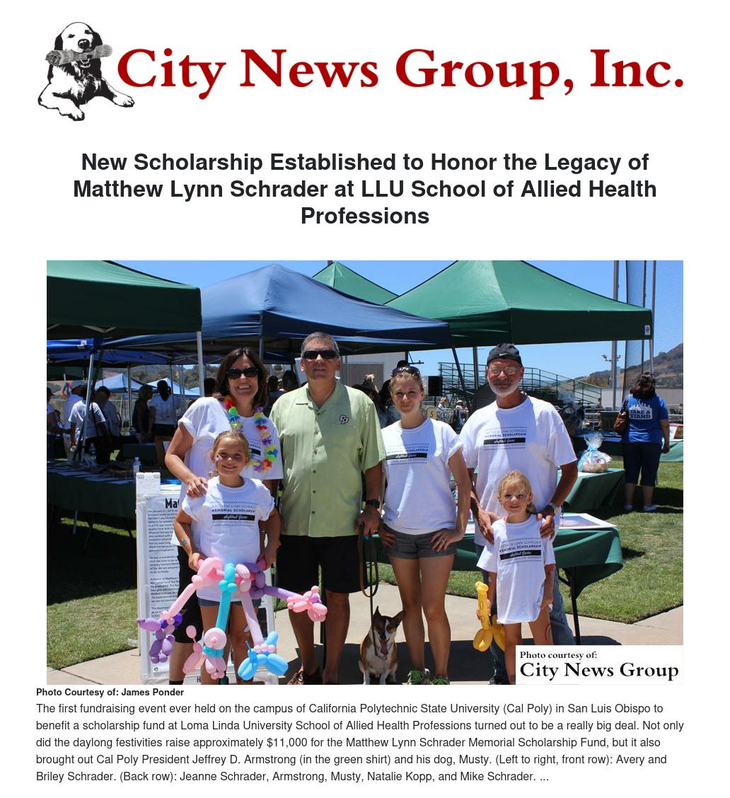 At the July event, a large group of friends and supporters from the San Luis Obispo community turned out, including Jeffrey D. Armstrong, president of Cal Poly SLO, and his dog, Musty. Kopp represented Loma Linda University at the event and said the affection and love of the Schrader’s for their deceased son electrified the day with positive joy.