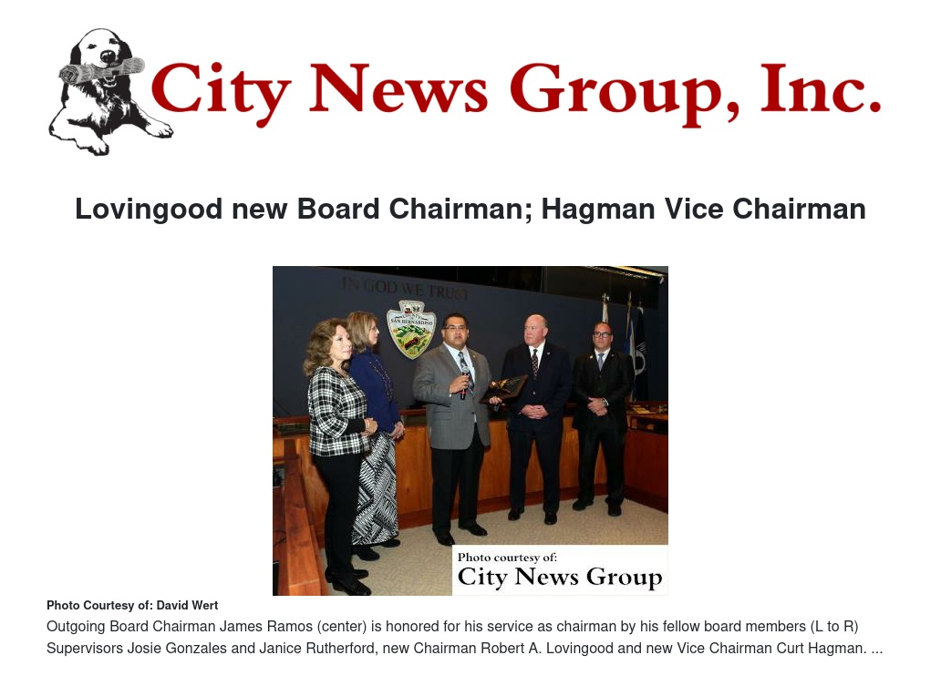 SAN BERNARDINO>> The Board of Supervisors unanimously elected Supervisor Robert A. Lovingood to serve as Board Chairman and Supervisor Curt Hagman to serve as Vice Chairman for the next two years.