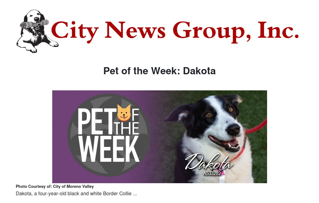 If you would like to make Dakota or any pet from the Moreno Valley Animal Shelter part of your family, please contact the Moreno Valley Animal Shelter at 951.413.3790 or visit www.moval.org/pets. |