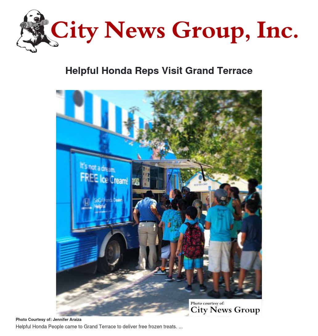 After a post on Facebook received numerous "likes" and comments, the Helpful Honda People responded by showing up unannounced and providing free ice cream to all the campers on the last day of the camp as a part of their Random Acts of Kindness. They also visited Grand Terrace Daycare and Grand Terrace High School Band Camp to provide frozen treats to all of those involved.