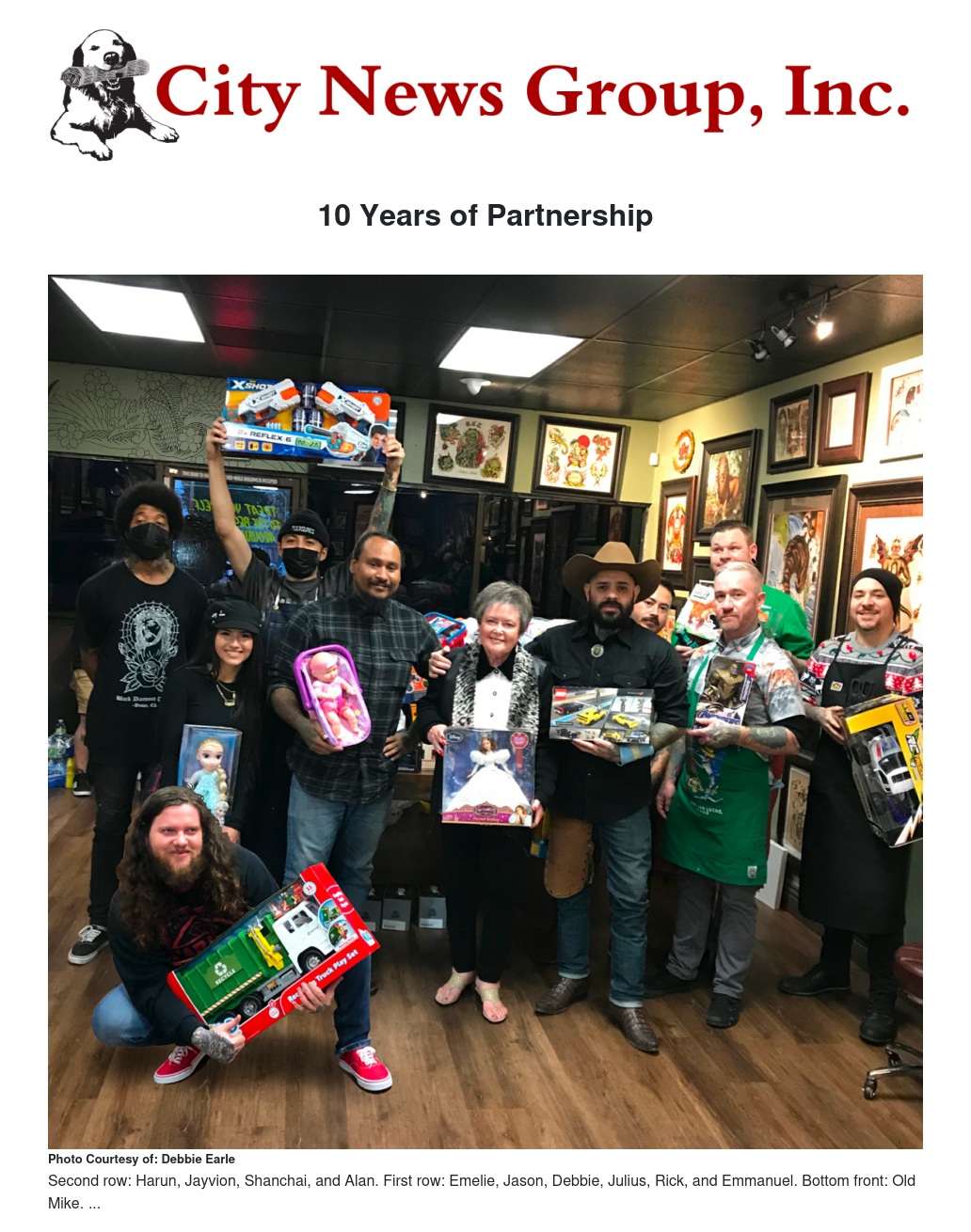 Julius Vargas however, still had his first location in Moreno Valley. In November 2010, Paragon Tattoo contacted the Grand Terrace Woman’s Club, President Debbie Earle sat down with these amazing gentleman that wanted to give back, and what better way to do this than to help children, through our Child Help Program. This started a beautiful relationship with the tattoo shop and the Woman’s Club. This has spanned over ten years and each year these guys work especially hard one day a year doing a 3x3 tattoo for $20 for a new unwrapped toy, valued at $15. Each year they bring in between 200 - 250 toys. You can’t imagine the joy it brings to each and every one of these tattoo artists, knowing they helped a child have a very Merry Christmas.