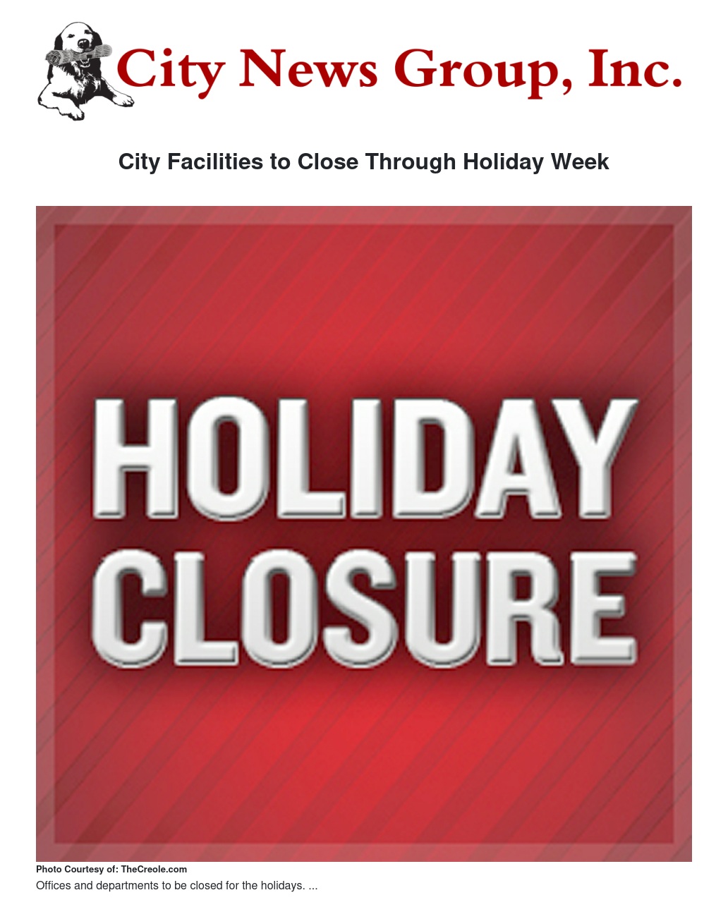 City Facilities to Close Through Holiday Week
