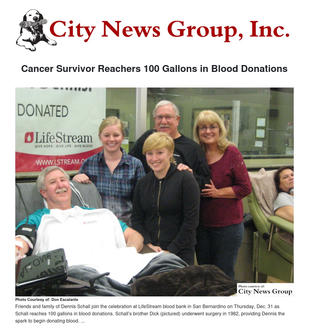 That was in 1982. But Dennis kept donating – and donating. And on the final day of 2015, the lifelong Redlands resident will become the eighth LifeStream donor to reach 100 gallons in blood donations.