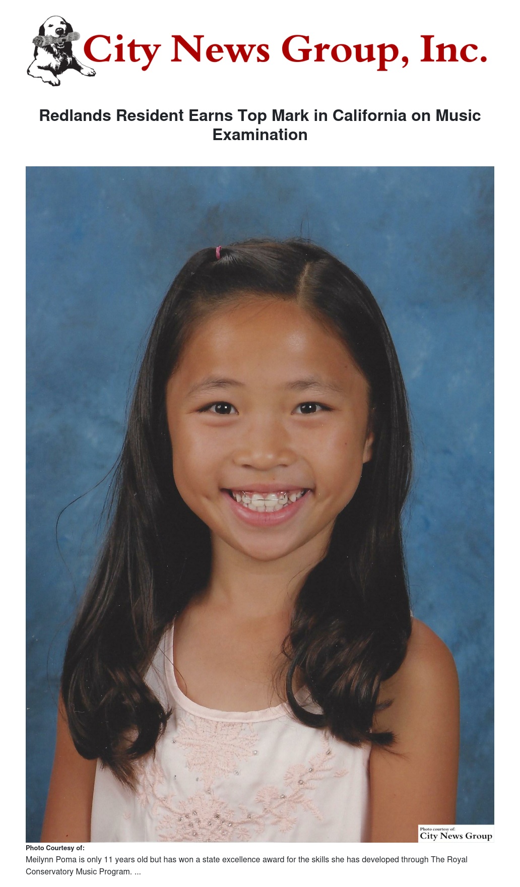 Meilynn Poma, 11, is one of two residents from Redlands to earn a Certificate of Excellence this year. Currently, Poma participates in The Royal Conservatory Music Program where she takes music lessons with San Bernardino-based teacher Erika Ramos.