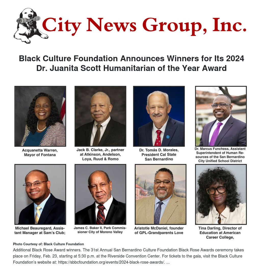 The 31st Annual Black Culture Foundation Black Rose Awards ceremony takes place on Friday, Feb. 23, starting at 5:30 p.m. at the Riverside Convention Center. For tickets to the gala, visit the Black Culture Foundation’s website at: https://sbbcfoundation.org/events/2024-black-rose-awards/.