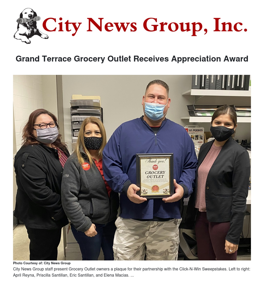 Grand Terrace Grocery Outlet was one of the many small businesses in the Inland Empire to partner with City News Group and participate in a Click and Win sweepstakes program, which was uniquely crafted to combat COVID-19 small business closures and bring some fun to residents in these difficult times.