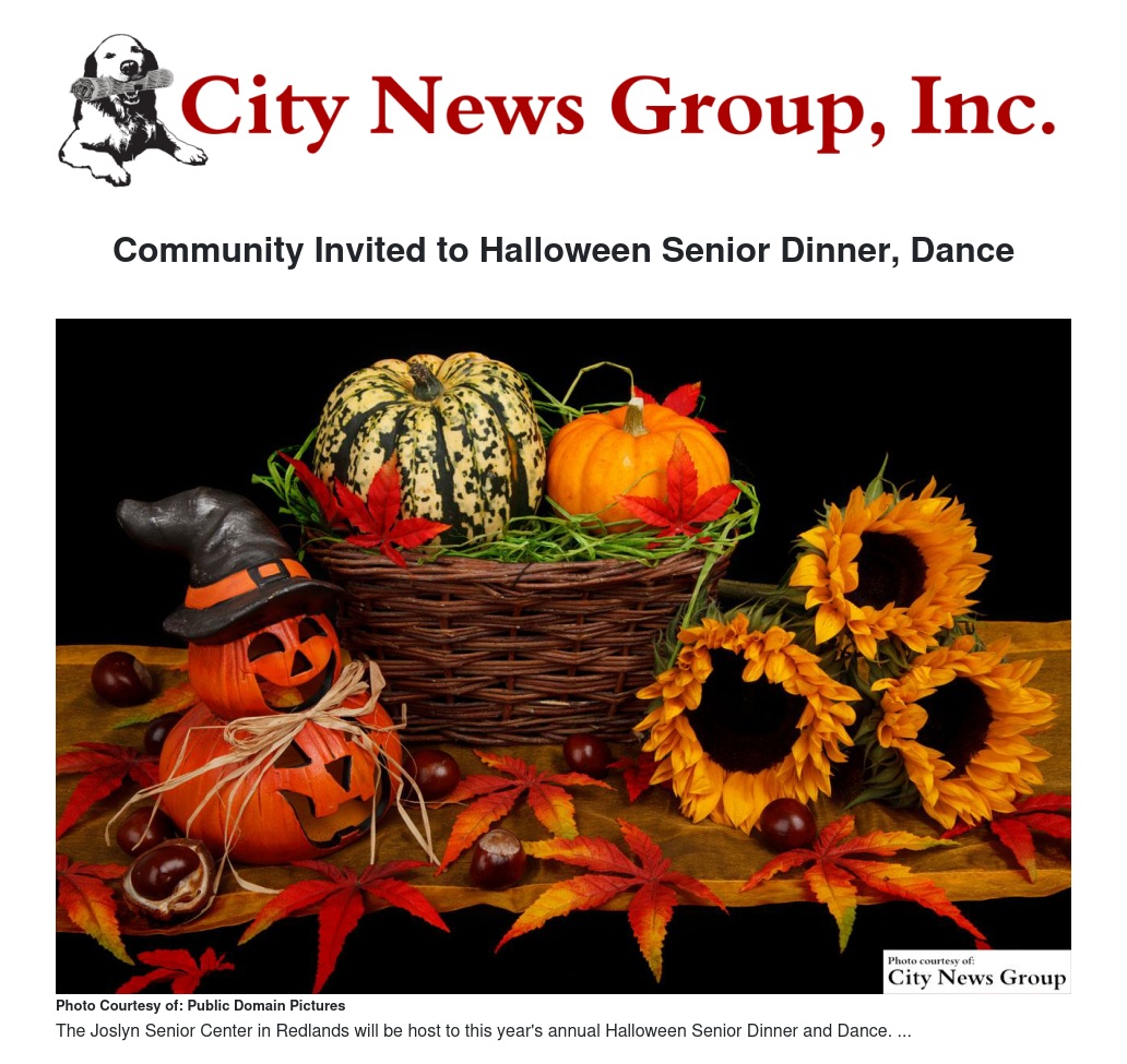 The Senior Services Division of the Redlands Quality of Life Department and Home Instead Senior Care of Redlands will host a Halloween Dinner Dance from 3 to 5 p.m. Thursday, Oct. 27, at the Joslyn Senior Center, located at 21 Grant St. in Redlands.