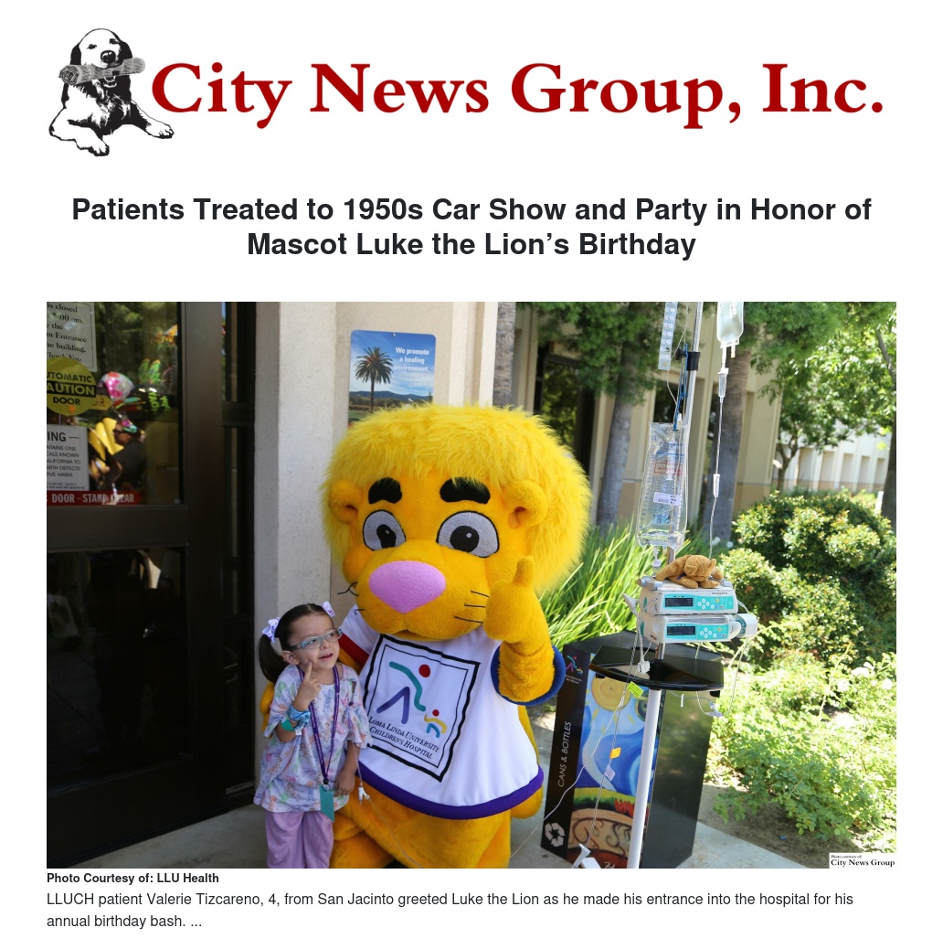 Loma Linda University Children’s Hospital (LLUCH) patients were taken back to the 1950s with a classic car show and party in honor of hospital mascot Luke the Lion’s birthday Monday, June 15. The annual event was all thanks to the collaboration and benevolence of Big Hearts for Little Hearts Loma Linda Guild and board member Carol Troesh.