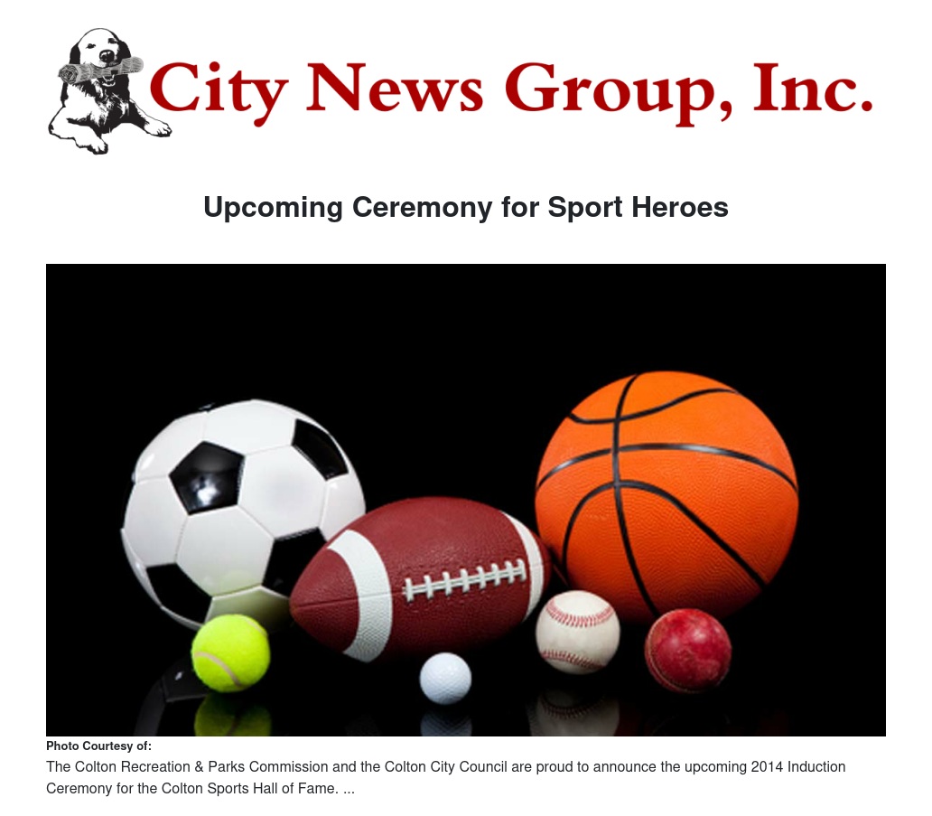 The Colton Recreation & Parks Commission and the Colton City Council are proud to announce the upcoming 2014 Induction Ceremony for the Colton Sports Hall of Fame. This year’s ceremony will take place at the Gonzales Community Center on Friday, April 25, 2014 at 6 p.m. The Colton Sports Hall of Fame is a shrine honoring Colton sports heroes, past and present. This year’s inductees are Ruben Acevedo, Tom Morrow, Stan Sanchez, and the Colton Mercury Senoritas Softball Team. The public is invited and welcome.