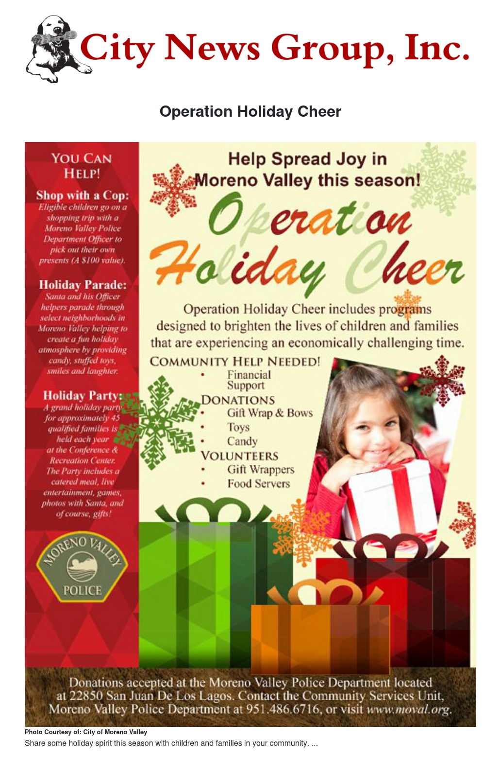 Operation Holiday Cheer includes programs designed to brighten the lives of children and families in Moreno Valley that are experiencing an economically challenging time. Donations and volunteers needed. Individuals or groups that are interested in dropping off toys, assisting financially, or volunteering, please contact Community Services Officer Manier at 951-486-6716.