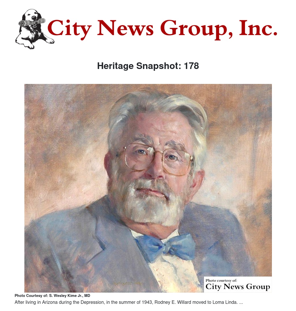 Rodney E. Willard, MD, is a descendant of Alexander Hamilton Willard, a blacksmith on the famous Lewis and Clark Expedition. He was born on July 21, 1927 in the old St. Helena Sanitarium, in the Napa Valley, near St. Helena, California. He is the oldest of six siblings. A company physician at the Phelps Dodge Copper Corporation clinic in Clarkdale, Arizona, and an inspirational teacher at Arizona Academy, had a major impact on Rodney’s decision to become a physician. After living in Arizona during the Depression, in the summer of 1943, the Willards moved to Loma Linda.
