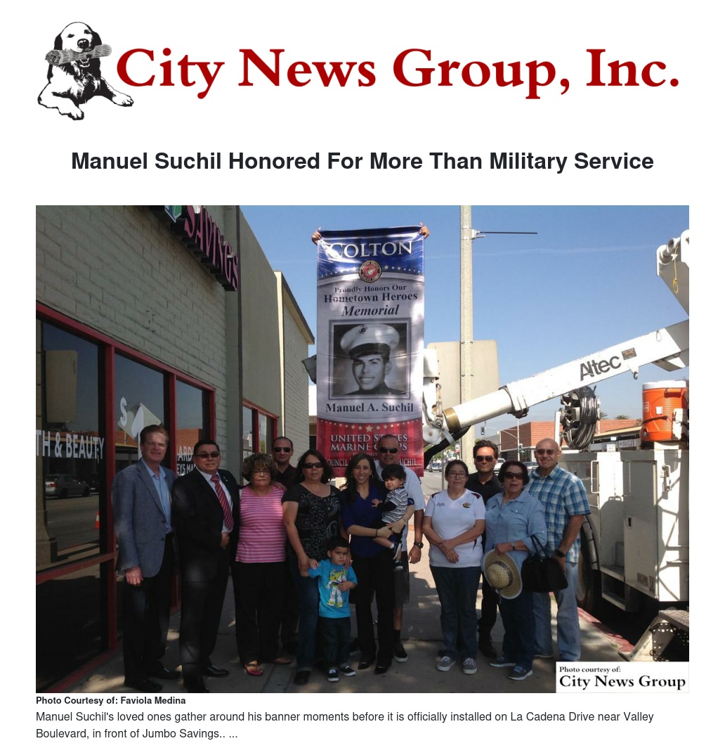 Manuel Suchil passed away on July 2, 2009 at the VA Medical Center in Loma Linda - but his memory lived on as his family, friends and other loved ones honored his service through the posting of his military banner high above the streets in Colton.