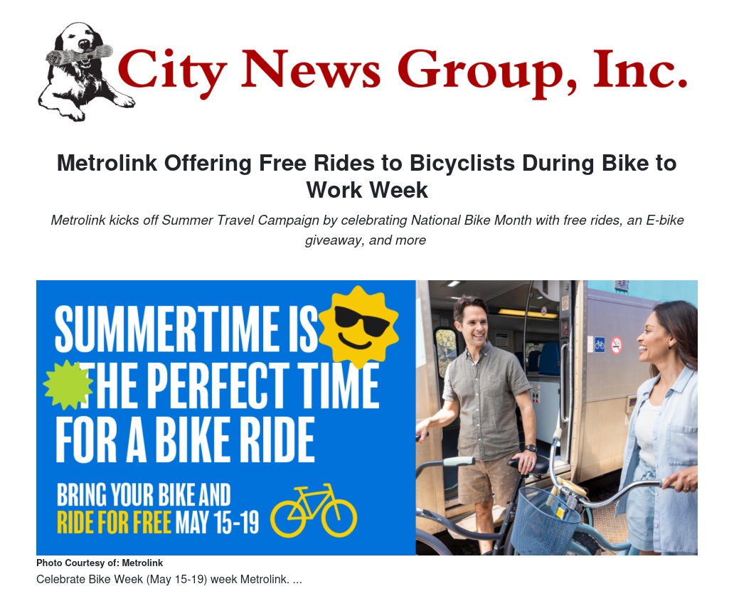 Metrolink Offering Free Rides to Bicyclists During Bike to Work Week by Anna P. Duff - City News Group, Inc.