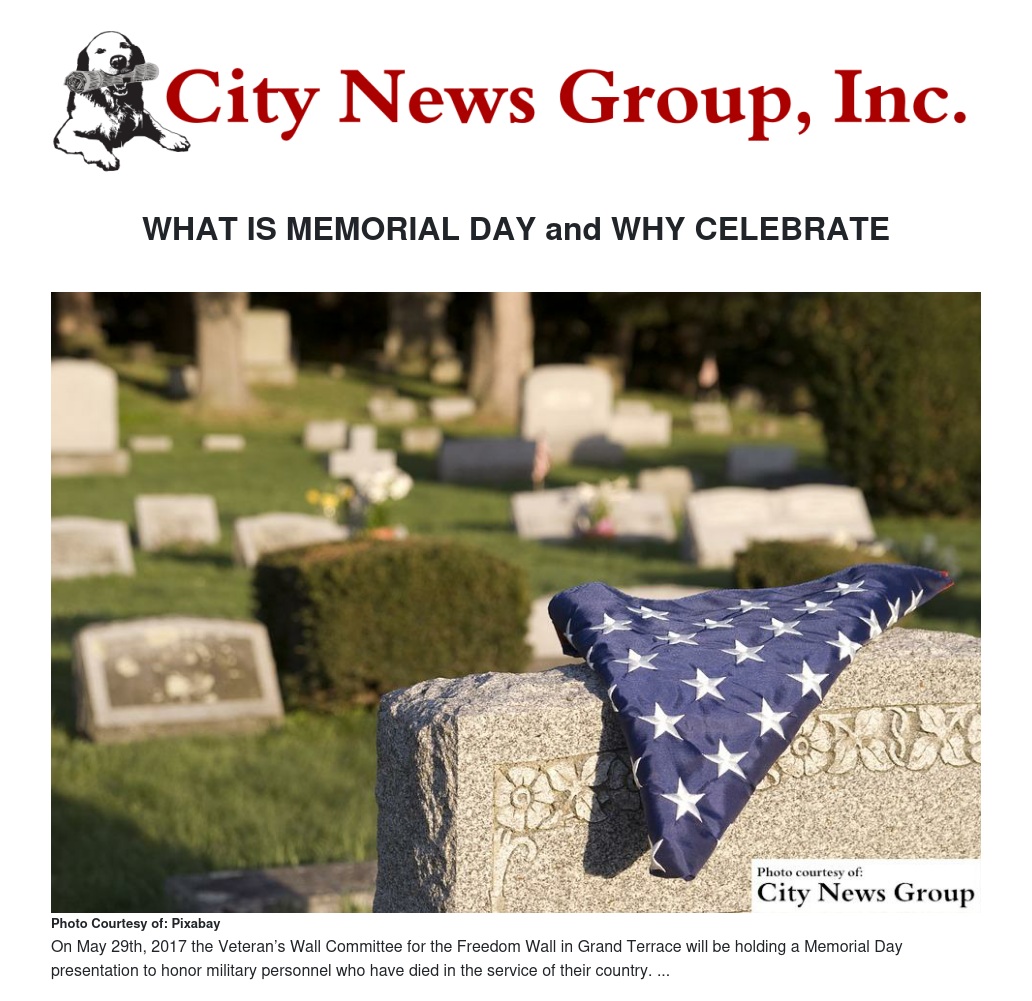 ALL>> On May 29th, 2017 the Veteran’s Wall Committee for the Freedom Wall in Grand Terrace will be holding a Memorial Day presentation to honor military personnel who have died in the service of their country, particularly those who have died in battle or through wounds sustained in battle. The presentation will begin at 11:00 a.m. at the Veterans Freedom Park (Pico Park) in Grand Terrace, California. The ceremony will feature the reading of names of those veterans on the wall that were killed in action.