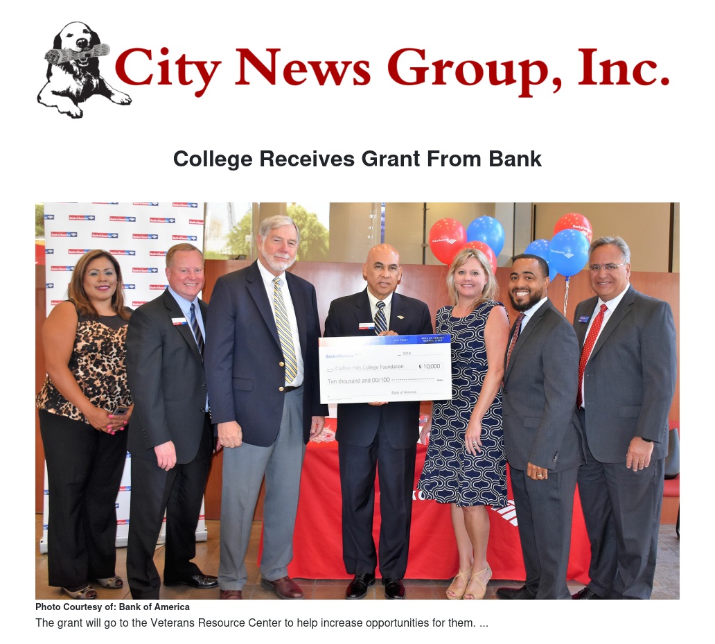 “We want to thank Bank of America for the $10,000 grant they awarded Crafton Hills College. The funds will be used to increase services in the Veterans Resource Center and to help students in the EMT, paramedic and fire programs,” said Michelle Riggs, director of community relations and resource development.
