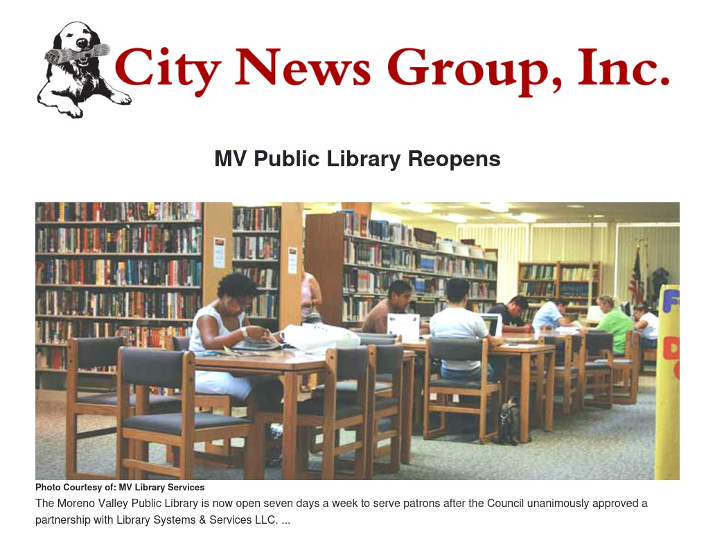 Barbara Mendoza is the Director of Corporate Communications with Maryland-based Library Systems & Services LLC (LSSI), the company which this month began operating the library in what Mendoza called a “public–private relationship” between LSSI and the City of Moreno Valley. In June the Moreno Valley City Council unanimously approved an agreement with LSSI to expand services to library patrons.