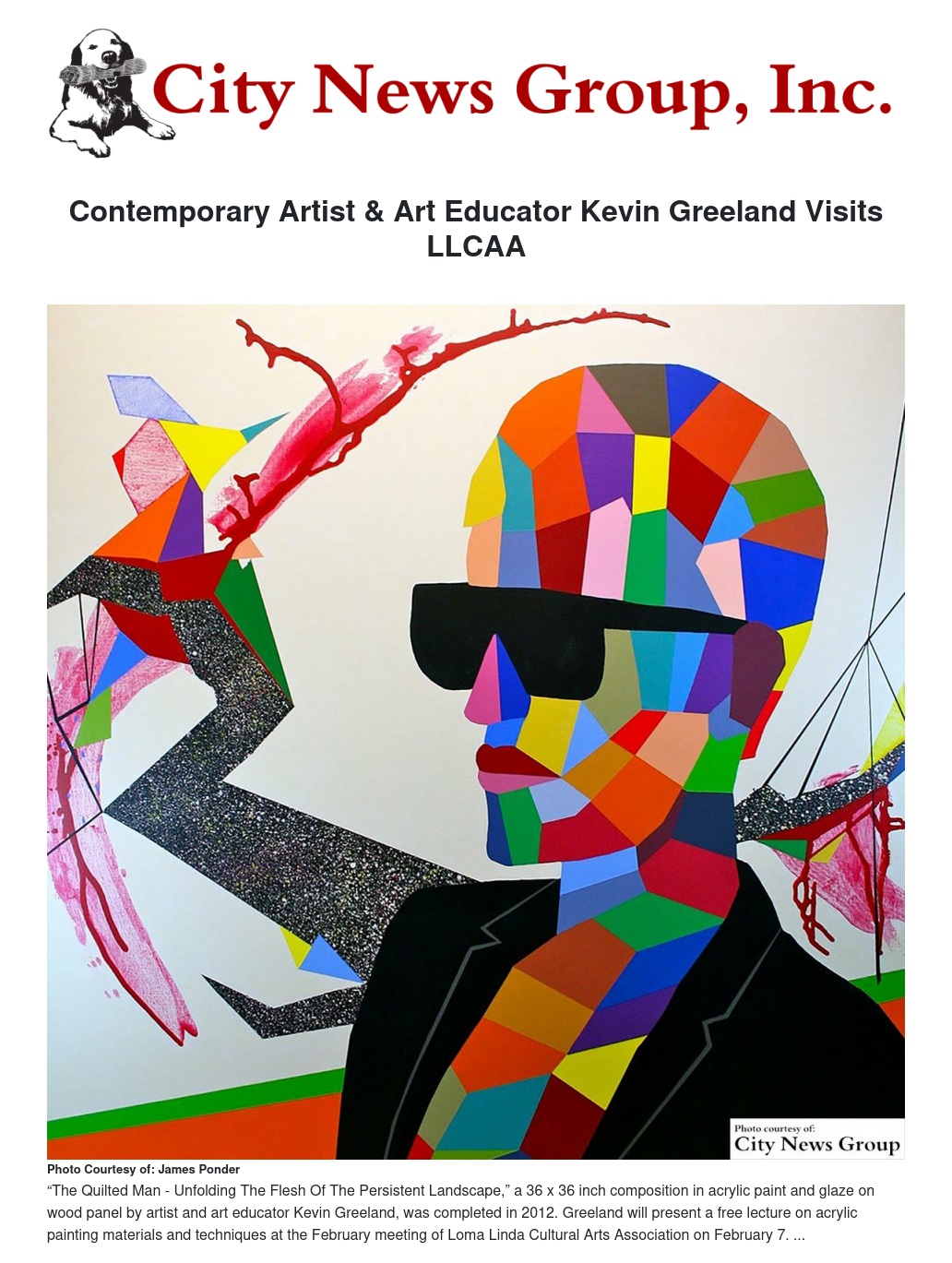 Kevin Greeland, MFA, a contemporary artist and art educator known for his colorful and provocative work in painting, sculpture, printmaking, photography, performance and bookmaking will present a free, two-hour demonstration of painting materials and techniques using popular Golden Acrylics products during the February meeting of the Loma Linda Cultural Arts Association (LLCAA).