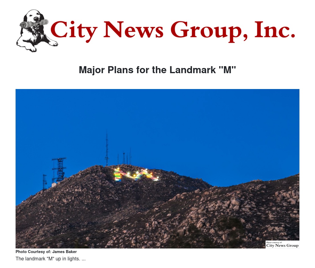 The "M" Landmark Improvement Project, a Community Organization led by Baker, successfully worked toward getting the "M" cleaned, painted and illuminated in 2013.