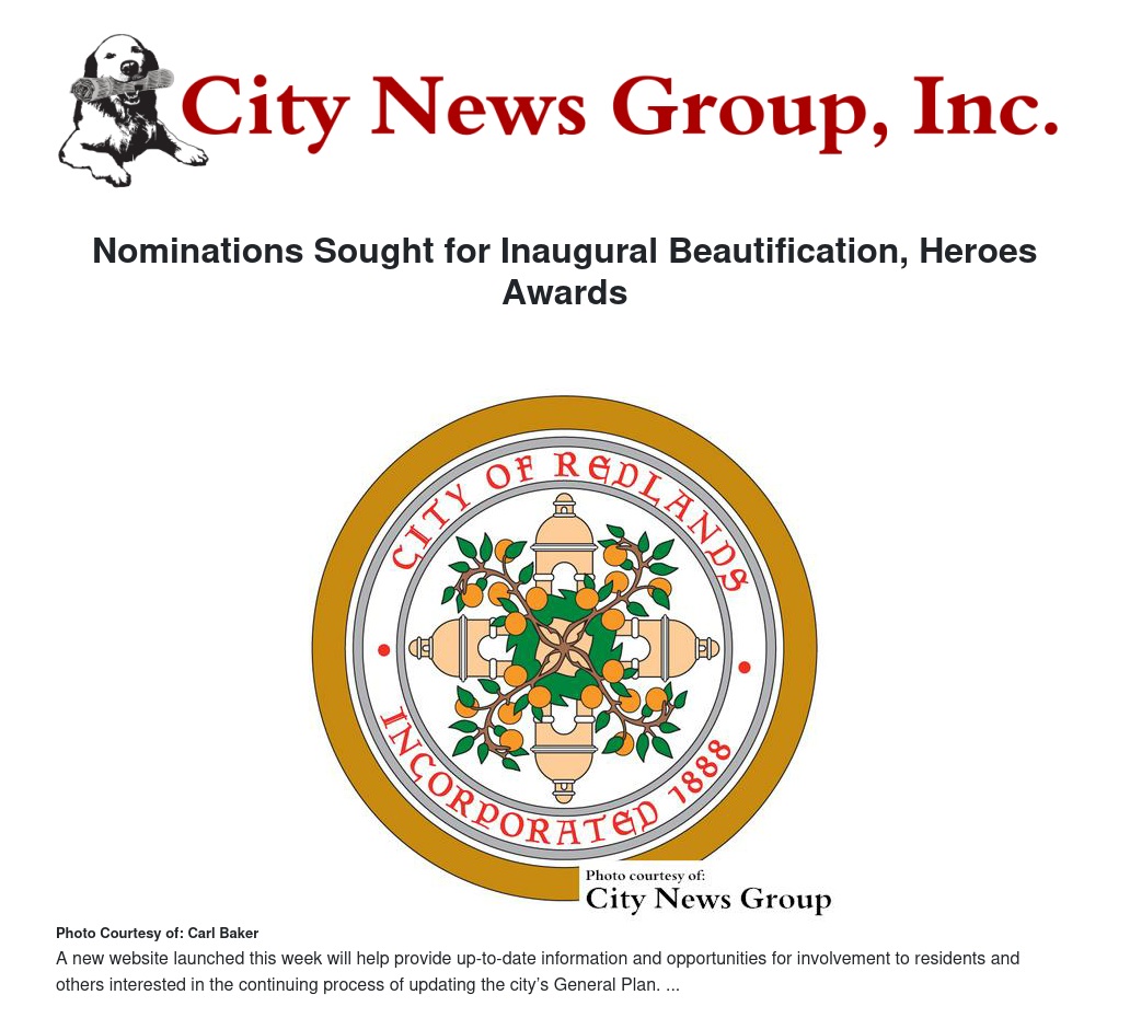 The City of Redlands invites nominations for the inaugural Beautification and Redlands Heroes Awards. Winners will be honored at the State of the City event at noon on Thursday, June 25, at the University of Redlands Orton Center, 1200 E. Colton Ave.