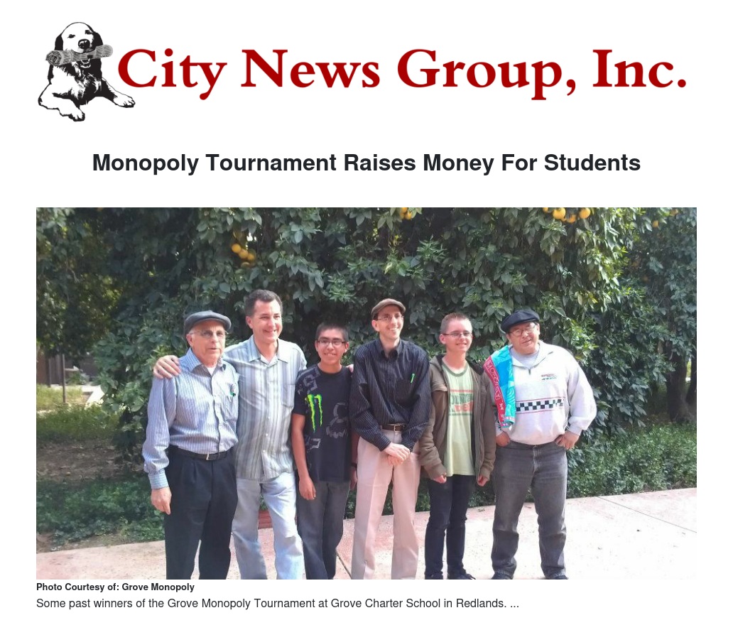 Advance to Go! Collect $200! Playing games and raising money went hand-in-hand at the 7th annual Monopoly board-game tournament at The Grove School in Redlands. Recently, players from all over the state and even a few from as far away as Australia came to participate in the classic Hasbro game to raise money to help graduating seniors to continue their education.