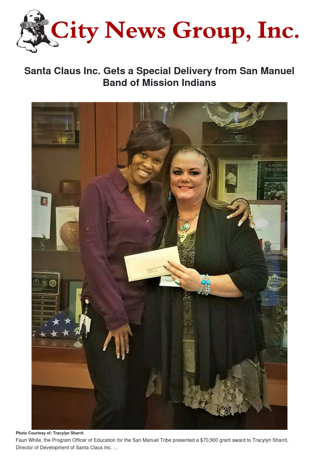 Santa Claus Inc. (SCI) is grateful to their partners at San Manuel Band of Mission Indians (San Manuel) for a generous grant. On October 11th, Faun White, who is the Program Officer of Education for the San Manuel Tribe, presented a $70,900 contribution to Tracylyn Sharrit, the Director of Development for SCI. The funds will support the mission of SCI, which is, “To provide critical services to youth in the Inland Empire by empowering families through year-round and seasonal programs.” Basic needs required by children in San Bernardino County continue to grow. In response to the increasing demand for services, SCI’s goal is to serve an estimated 120,000 children by the end of 2017 – an increase of 500% since 2012. The $70,900 from San Manuel is vital to ensure that SCI has the financial means to deliver on their mission and promise to meet their goals.