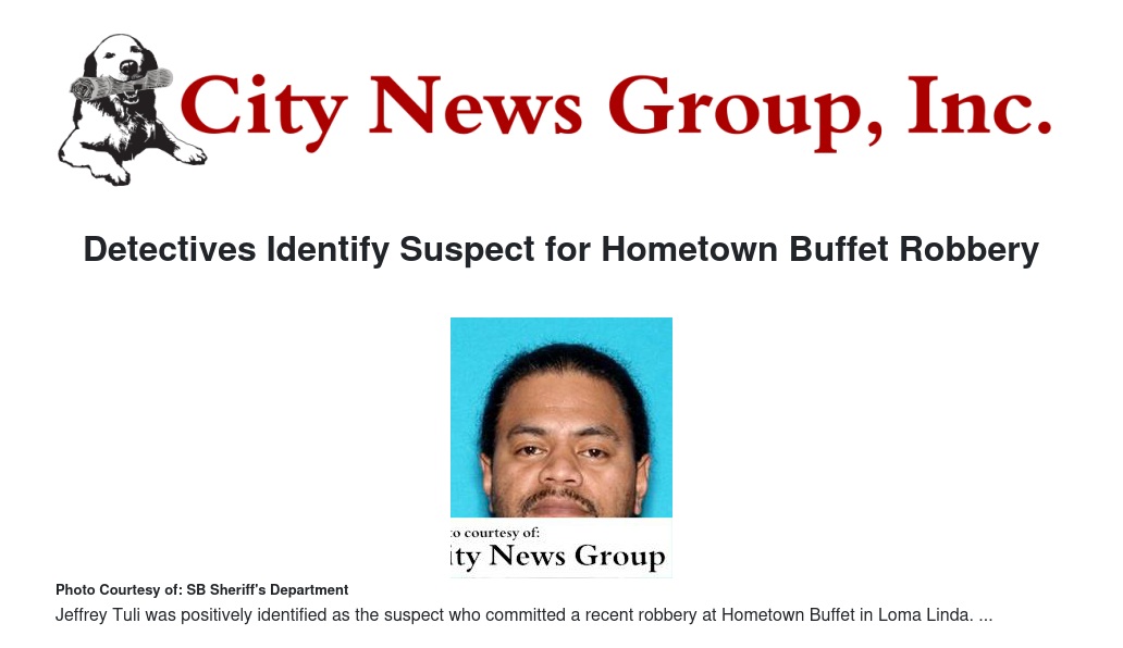 Detectives Ruiz and Lara from Sheriff's Central Station continued to investigate the unsolved crime. Working with detectives from Riverside County and Sheriff's Rancho Cucamonga Station, Ruiz and Lara received information and identified Jeffrey Tuli as a possible suspect. Ruiz and Lara conducted a follow-up Aug. 17 and spoke with an employee from Hometown Buffet. Using a photographic line-up, the employee positively identified Tuli as the suspect who committed the robbery.