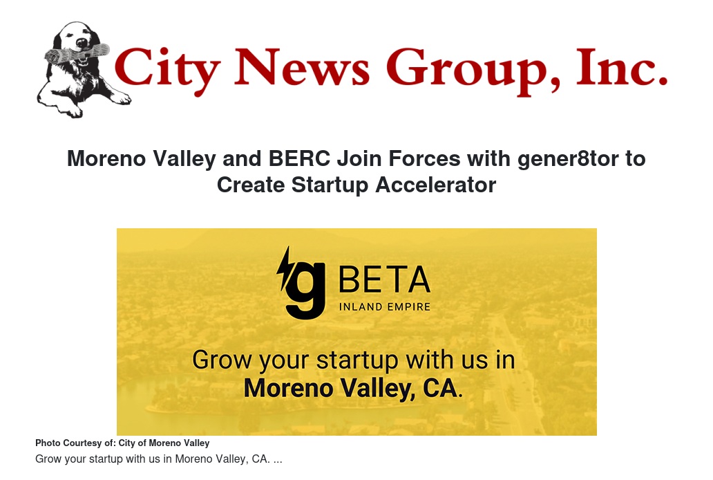The City of Moreno Valley and its Business & Employment Resource Center (BERC) have partnered with global venture firm and startup accelerator gener8tor to announce the inaugural gBETA Inland Empire pre-accelerator. Powered by gener8tor, the accelerator focuses on early-stage companies working across all industries operating in the Inland Empire region.