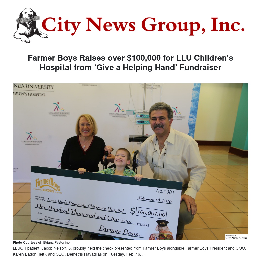 Farmer Boys Raises over $100,000 for LLU Children's Hospital from ‘Give a Helping Hand’ Fundraiser