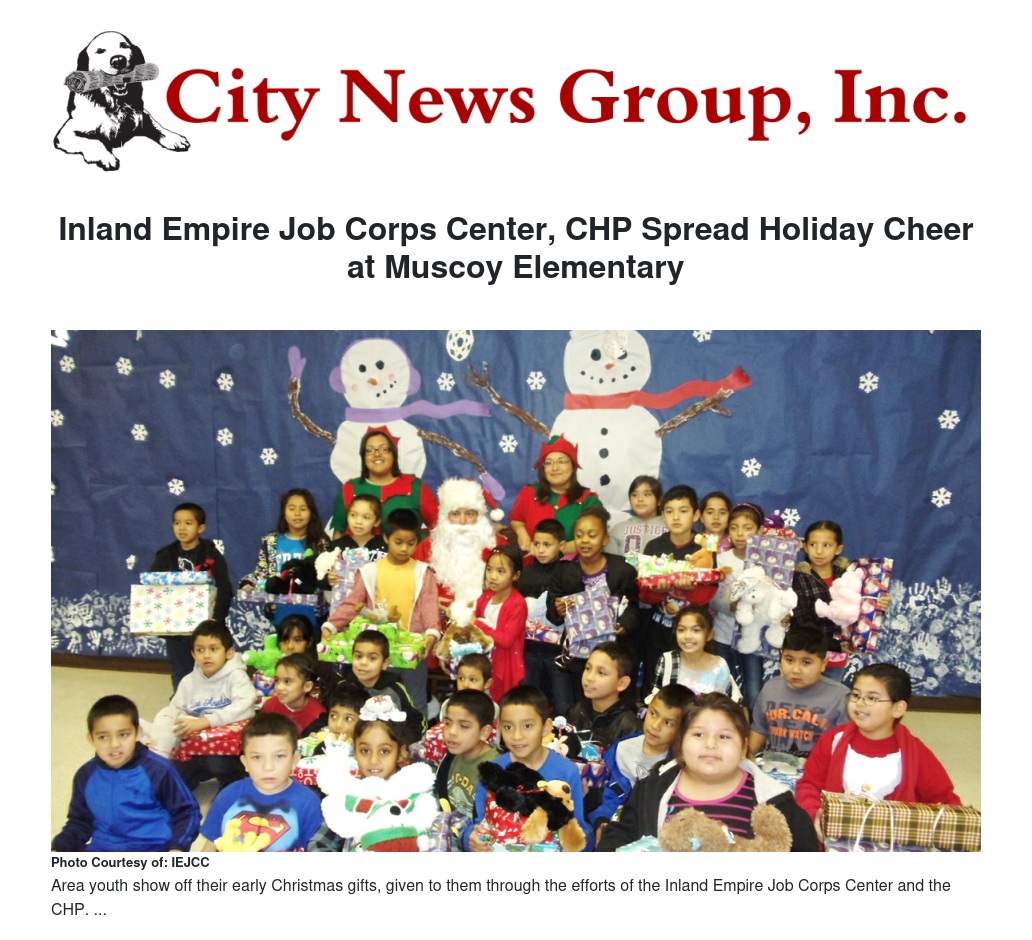 For two consecutive years the Inland Empire Job Corps Center and San Bernardino Area CHP have joined together to bring holiday cheer to children less fortunate at Muscoy Elementary School. Santa and two of his elves handed out toys to students that day.