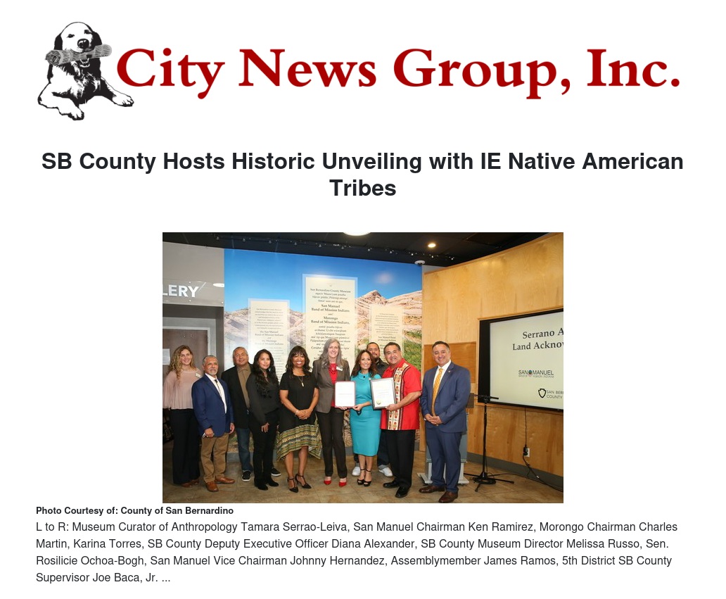 For the first time in Inland Empire history, San Bernardino County officials acknowledged Native American tribal land by announcing that its museums — including the San Bernardino County Museum (Redlands), Victor Valley Museum (Apple Valley), and Yucaipa Adobe — are sited upon the ancestral territory of the Maara’yam (Serrano) people. The County of San Bernardino joined elected leaders from the San Manuel Band of Mission Indians, Morongo Band of Mission Indians, California State Senate, and California State Assembly in celebrating the unveiling of a written proclamation display at the entrance to the San Bernardino County Museum.