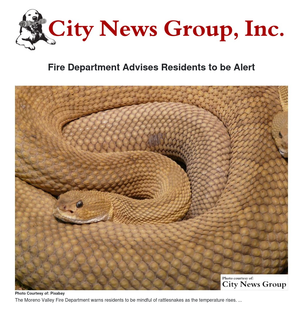 MORENO VALLEY>> As the summer season approaches and temperatures rise, the number of snake sightings increases. The Moreno Valley Fire Department would like to share some important safety tips about snakes, particularly rattlesnakes, which are found across Southern California.