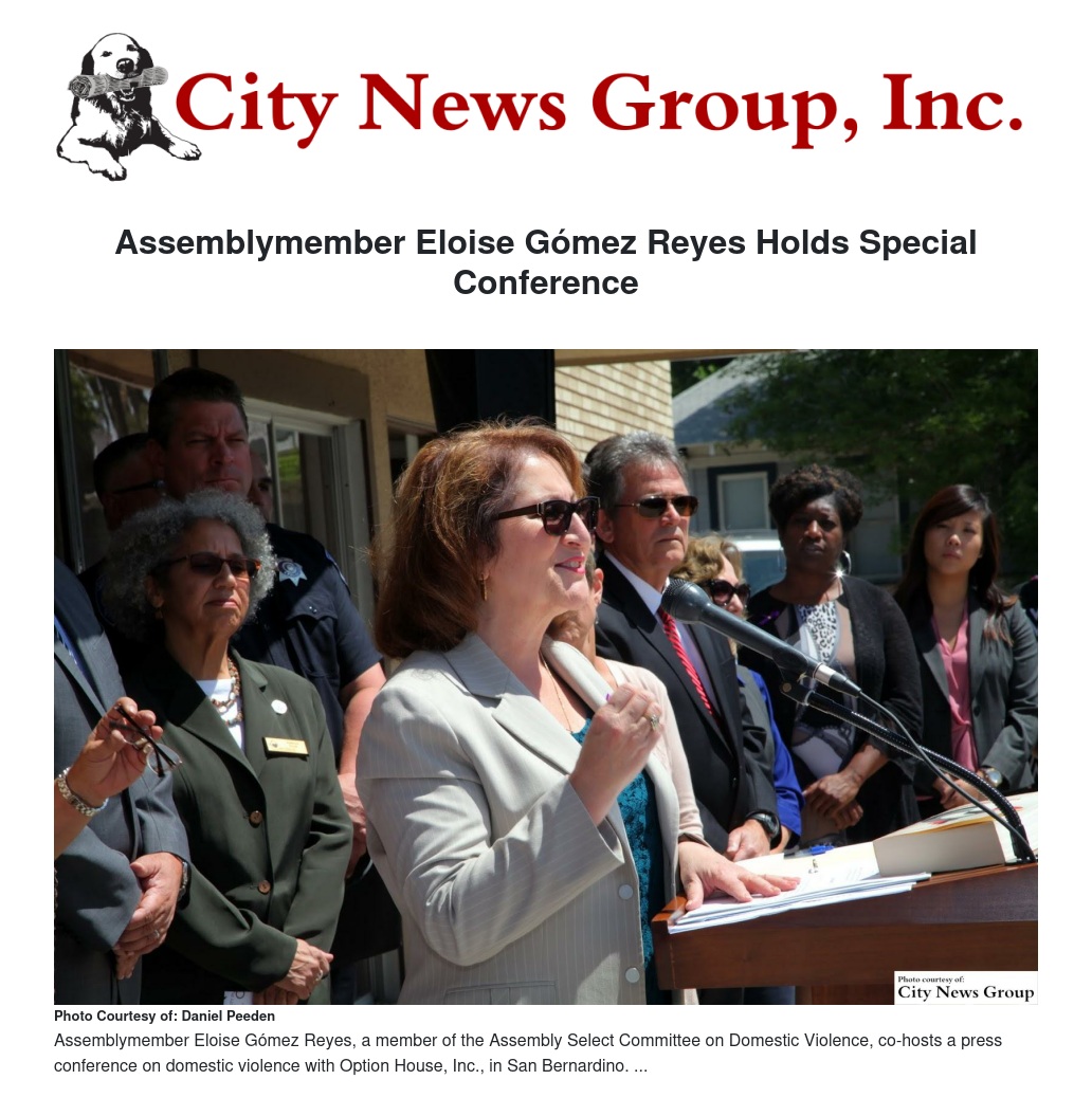 SAN BERNARDINO>> On Wednesday, April 12, Assemblymember Eloise Gómez Reyes, a member of the Assembly Select Committee on Domestic Violence, co-hosted a press conference on domestic violence with Option House, Inc. in San Bernardino to discuss the issue of domestic violence and the stigma related to speaking out when being victimized.