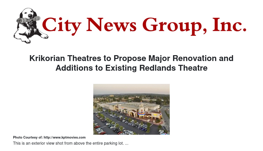 George Krikorian, President of Krikorian Premiere Theatres recently announced company plans to renovate and expand its current 14 screen complex at Eureka and Shopper’s Lane in Redlands.