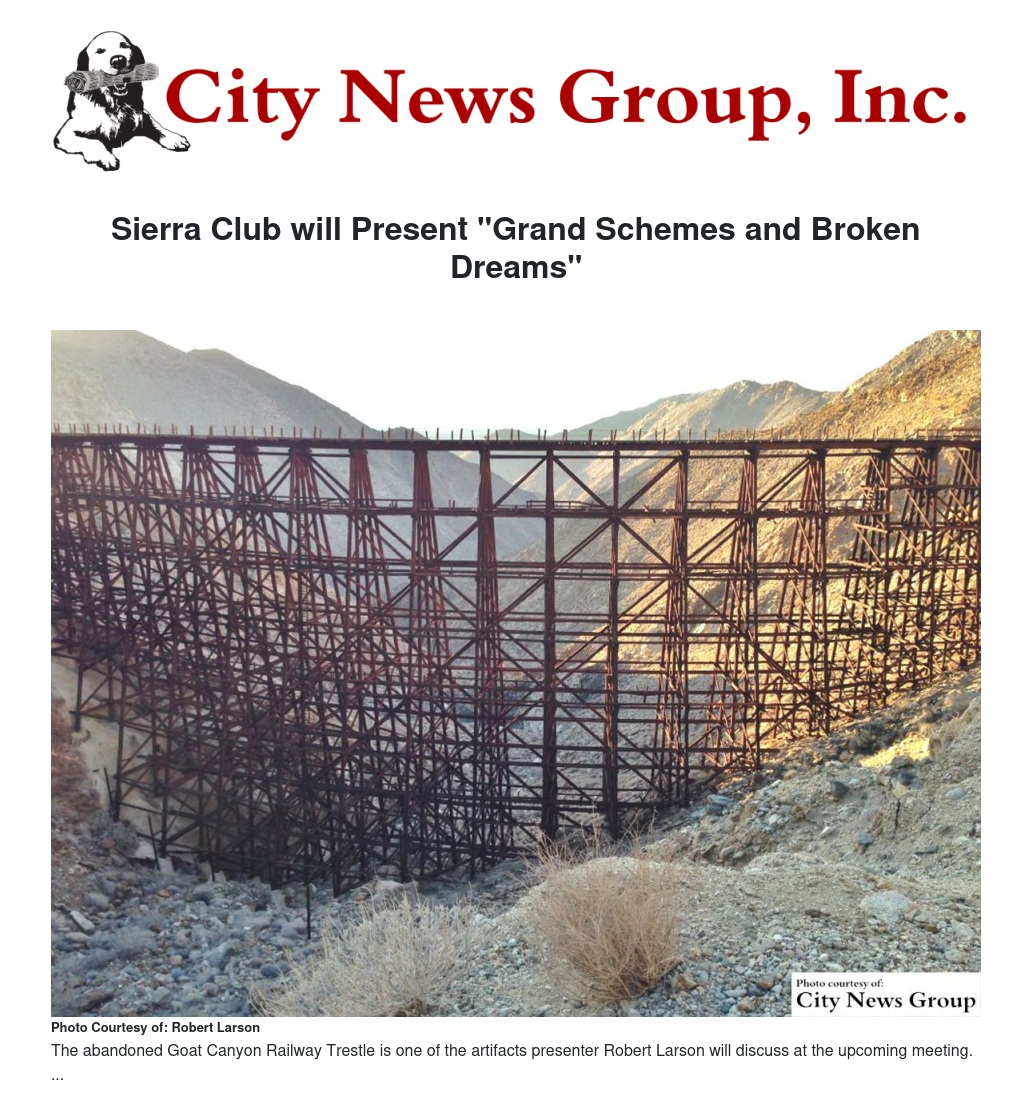 Larson’s history presentation features the Salton Sea, the Goat Canyon Railroad Trestle and the Bridge to Nowhere, why they are there, what they were intended to become and what they are today. He will show how all three, in different ways, are related to water and Southern California water management.