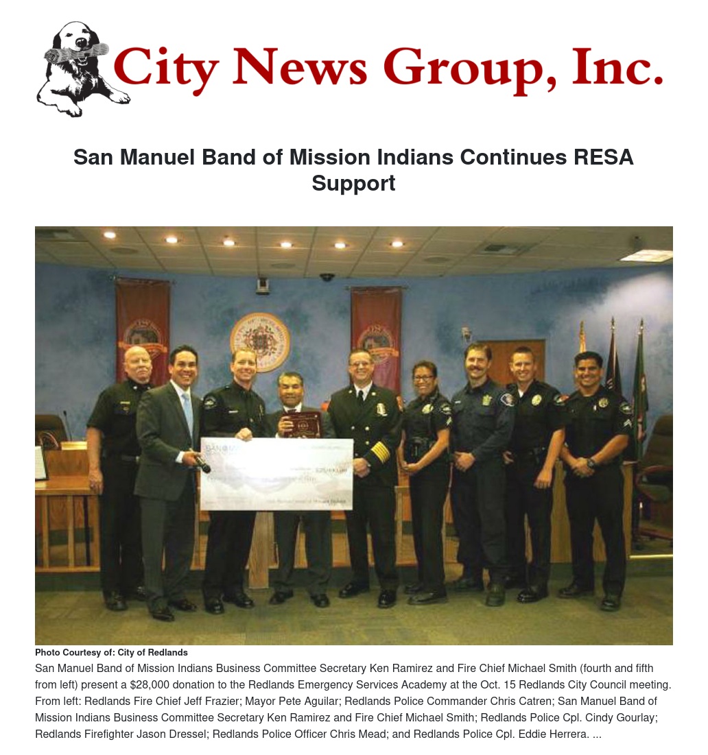The San Manuel Band of Mission Indians recently donated $28,000 to the Redlands Police Officers Association to support the Redlands Emergency Services Academy. For the past five years San Manuel has supported the program, which mentors young high school graduates.