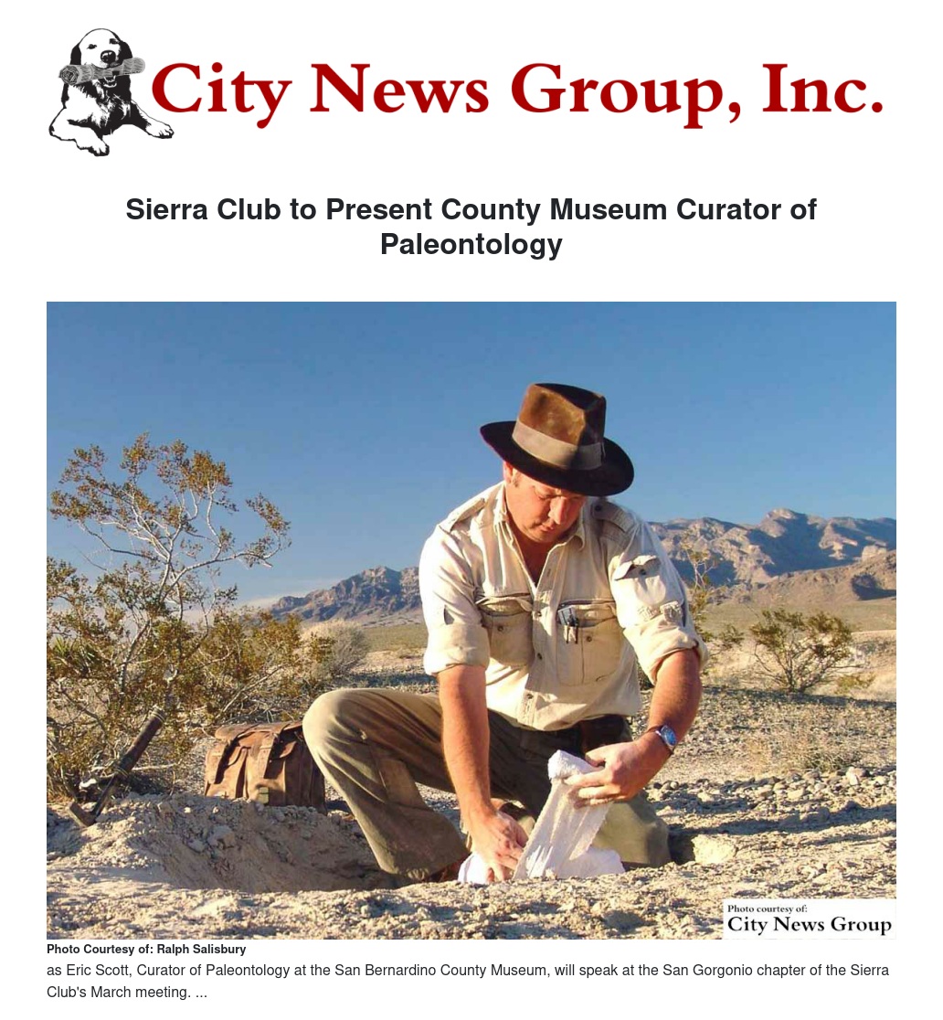 On Tuesday, March 3, the San Gorgonio Chapter of the Sierra Club will have their monthly meeting at the San Bernardino County Museum in Redlands at 7:30 p.m. Eric Scott, Curator of Paleontology at the San Bernardino County Museum, will present his illustrated program, “Evolving Icons: Ice Age Horses of the American West.” The meeting is free and open to the public.